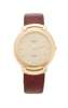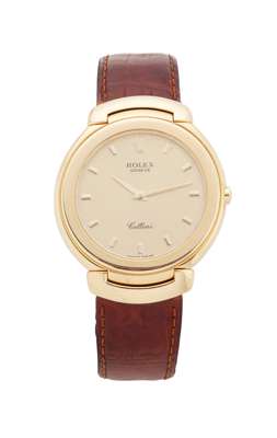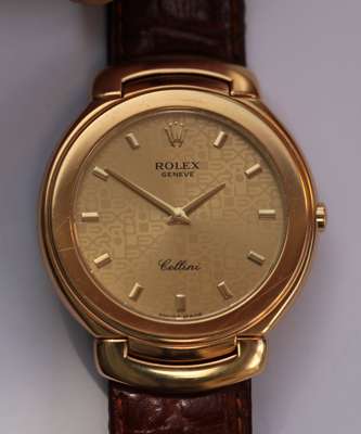 Cellini - fixed lugs, leather strap, gold fittings, broad bezel, Rolex background to the dial, Rolex crown at 12, baton numerals, quartz movement mo. 6620, IN ROLEX BOX