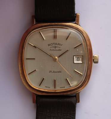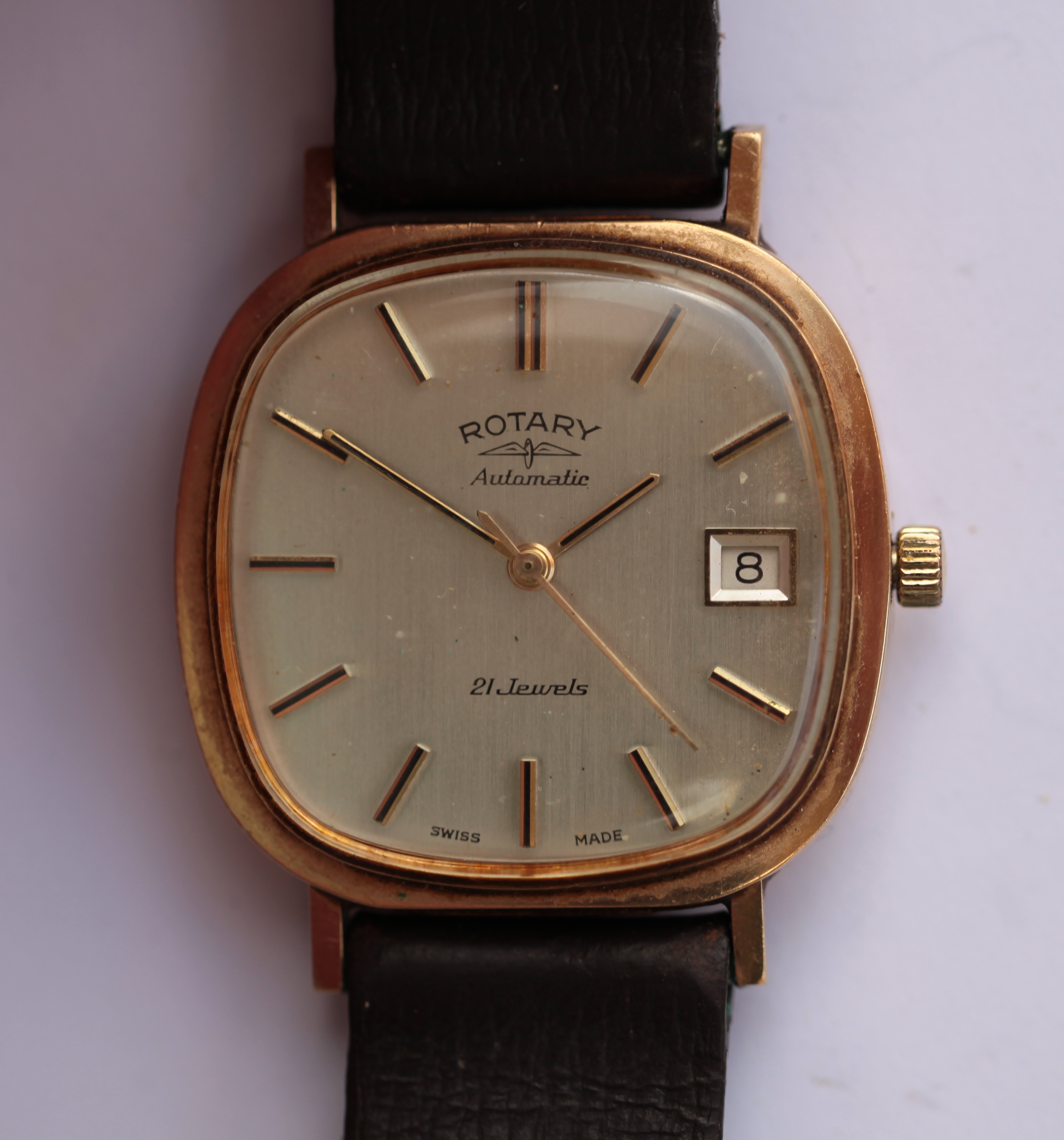 champagne dial, inscribed, sweep second hand, baton numerals, date aperture, plain case; a ROTARY 9ct gold gentleman's wrist watch, champagne rounded rectangular dial, baton numerals, date aperture, automatic movement, leather strap; A Victorian 9ct gold cased small keyless wind fob watch, gilt dial, engraved case, lever movement, all in a fitted Fattorini of Bradford case