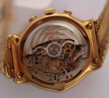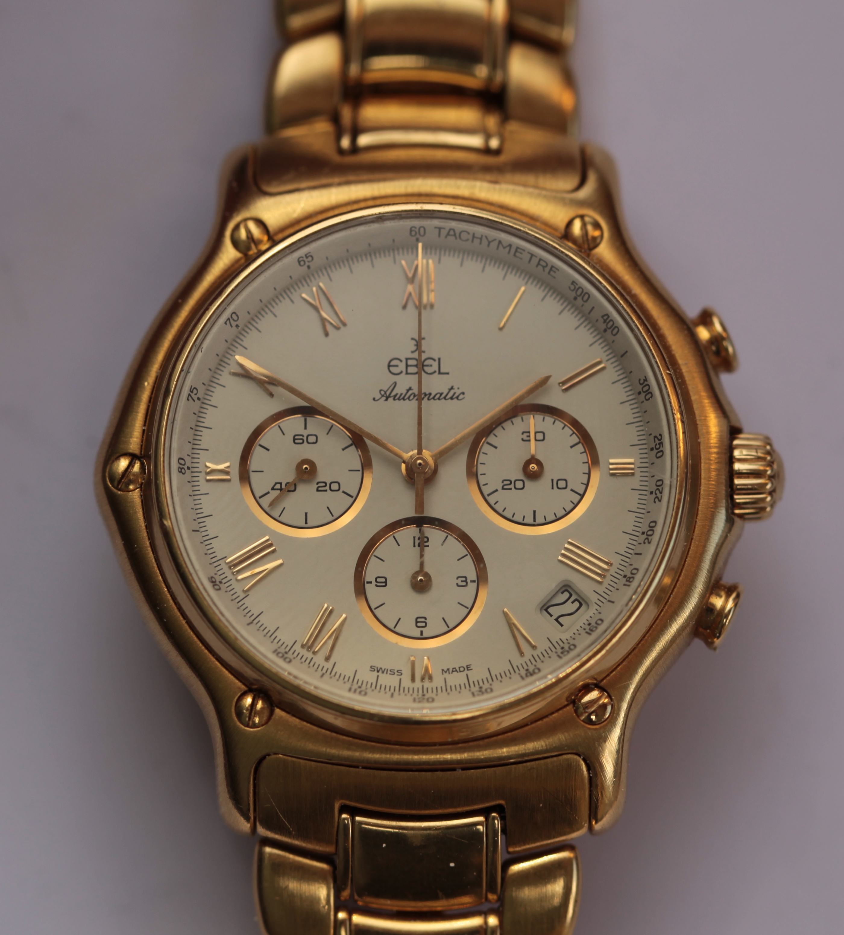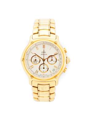 1911 BTR Chronograph - off white chronograph dial, gilt Roman numerals, gilt hands, sweep second hand, tachometer outer dial, subsidiary dials, integral 18ct gold bracelet, Ebel caliber 134 movement, numbered to the case 717 8134901, with leather case, box, booklets and card