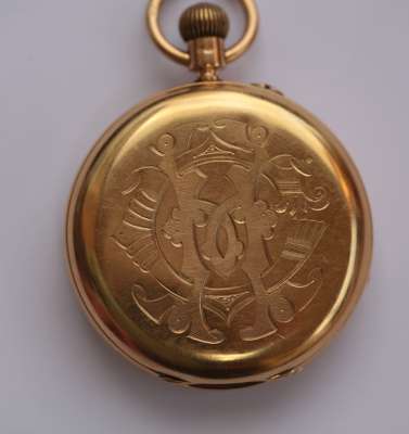 plain white dial with Roman numerals, subsidiary seconds dial, the case with well engraved monogram, engraved Police inscription to the cuvette dated 1893, three quarter plate lever movement inscribed, P J Stockall, Clerkenwell Road, London and numbered 10738
