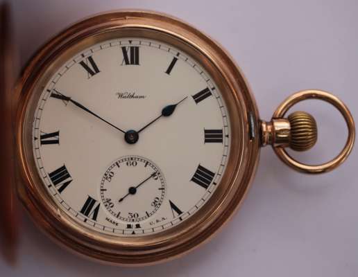 white enamel dial, inscribed Waltham, Roman numerals, subsidiary seconds dial, plain case, Waltham lever movement no. 22104180