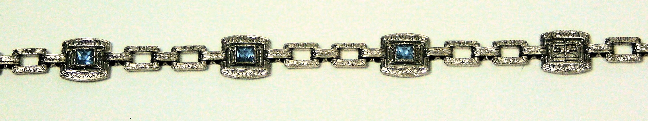 set with square cut aquamarines in an open border with chased detail, the other links with similar detail, stamped 14k