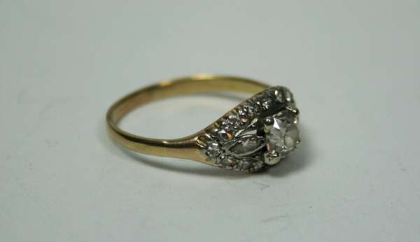 claw set to the centre with a cushion cut diamond flanked to either side by a navette shaped diamond in a border set eight cut diamonds, shank unmarked
