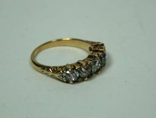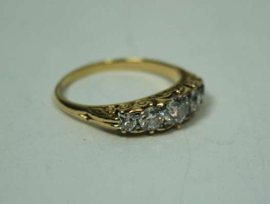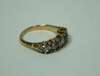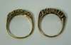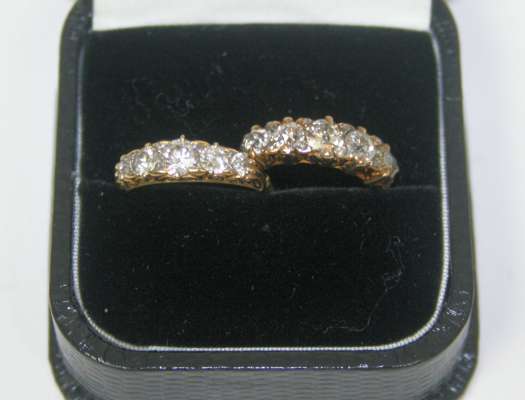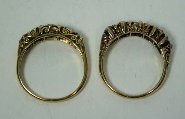 claw set in a scrolling gallery with five graduated round cut diamonds, to a yellow metal shank; together with another of similar design (2)