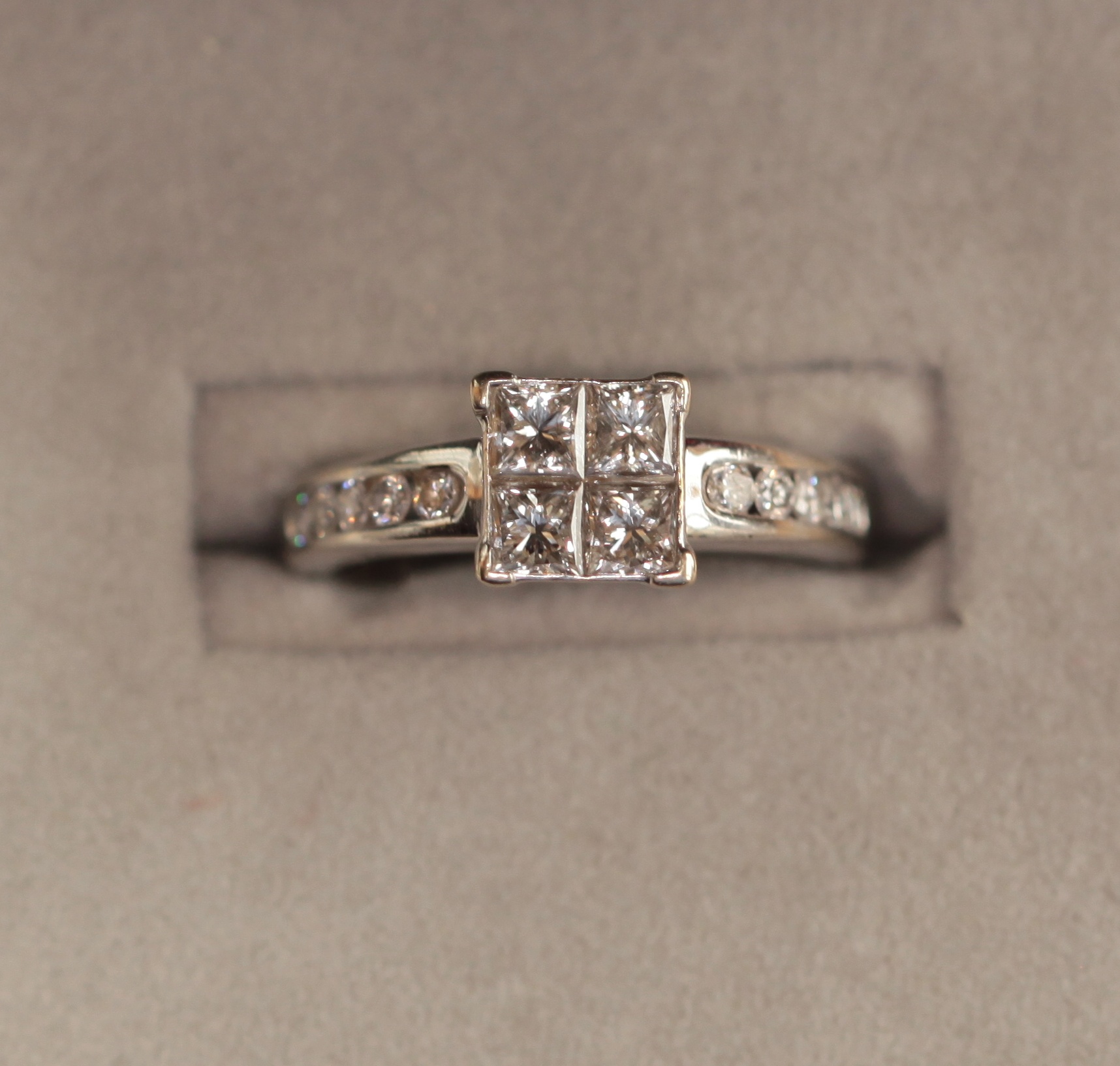 the four princess cut diamonds in a square setting, diamonds to the shoulder, and a half hoop eternity ring, channel set with ten circular cut diamonds (2)