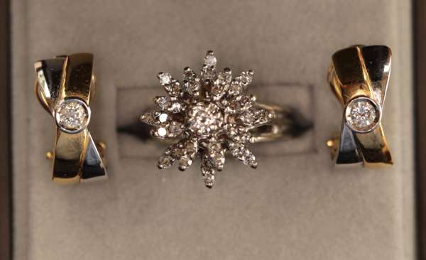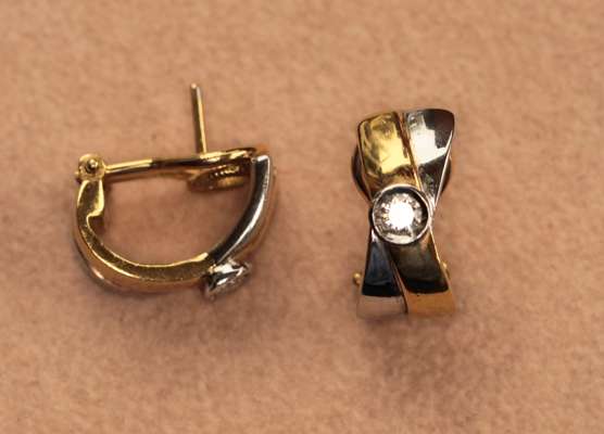 claw set to the centre with a round brilliant cut diamond, in a double border of lozenge shaped leaves each set with two round cut diamonds; together with a pair of 18ct two colored gold earrings, composed of two intersecting bands, collet set to the centre with a round cut diamond, with post and clip fittings (2)