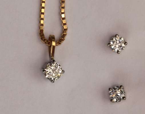 the single round brilliant cut diamond claw set in white metal, suspended from a 9ct yellow gold box link chain; together with a pair of round brilliant cut diamond ear studs, claw set in 18ct gold, with post and butterfly fittings (3)