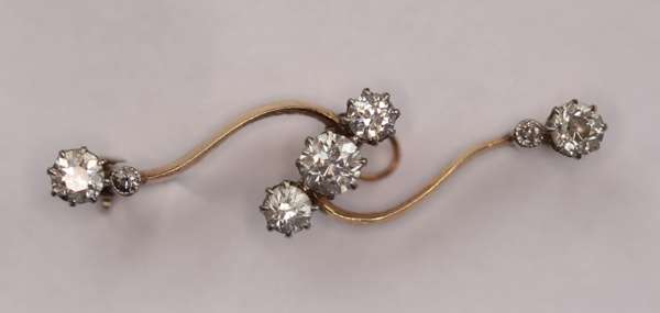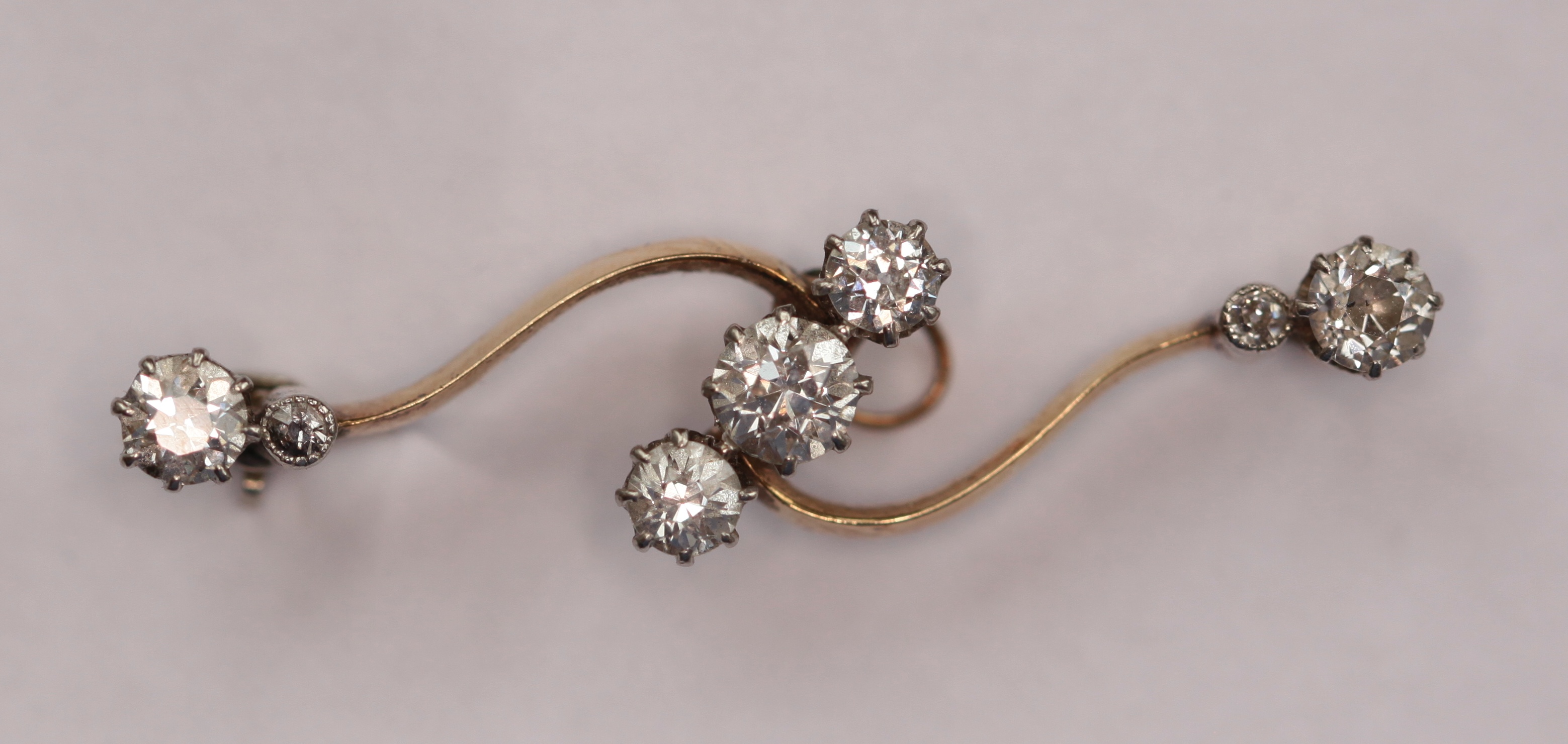 of scrolling knife edge form, set with three angled graduated diamonds to the centre and two to the terminals