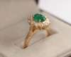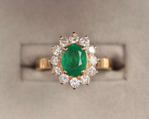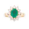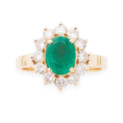 claw set to the centre with an oval cut emerald of attractive colour, in a border of twelve round cut diamonds, to a yellow metal shank with raised shoulders, stamped 18CT