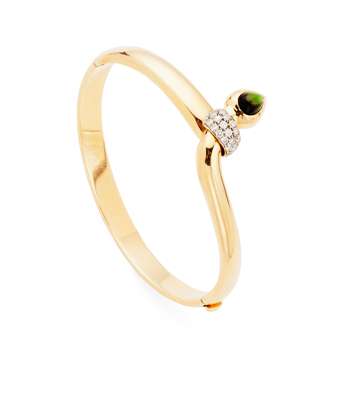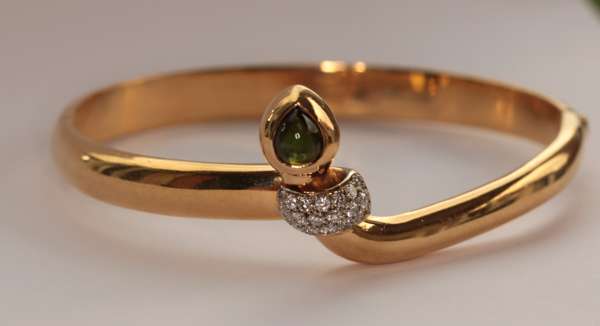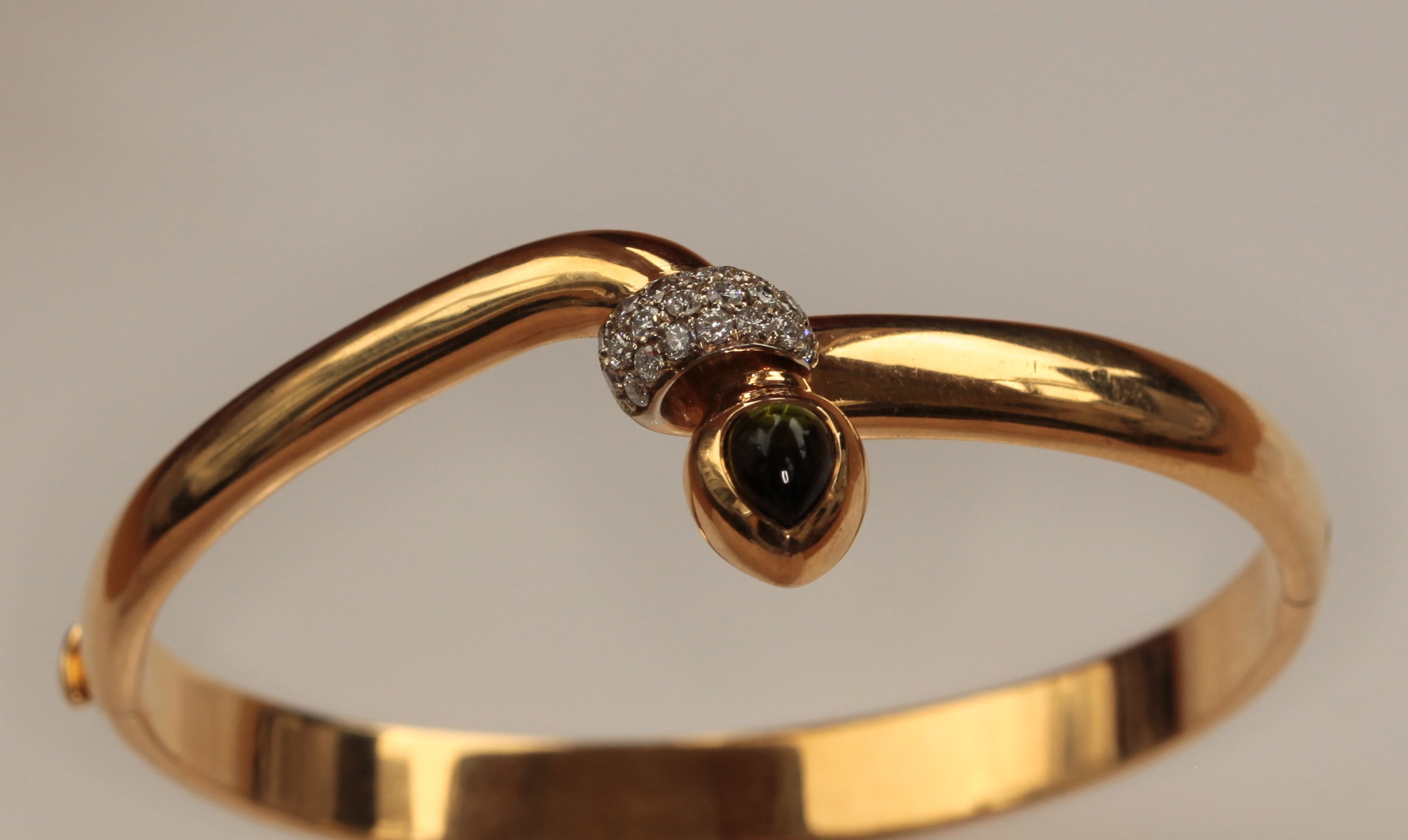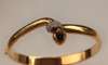 the broad plain hinged bangle with stylised almandine garnet palmette motif and diamond set collar, signed