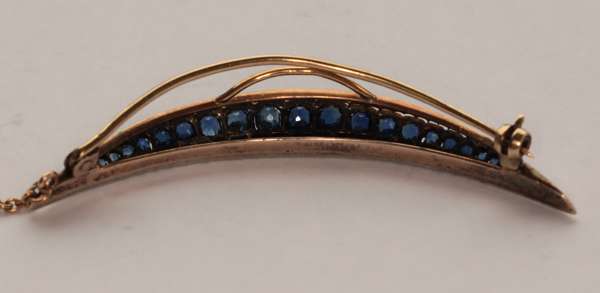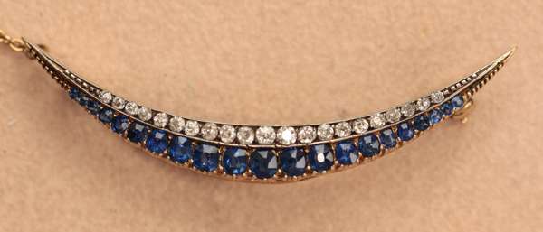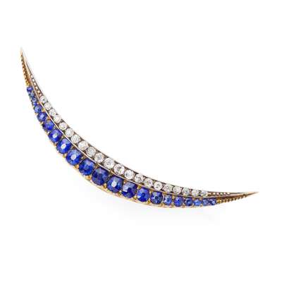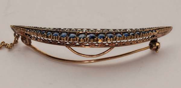 of open form, set with two borders of graduated circular cut sapphires and old European cut diamonds, with hinged pin and additional safety chain