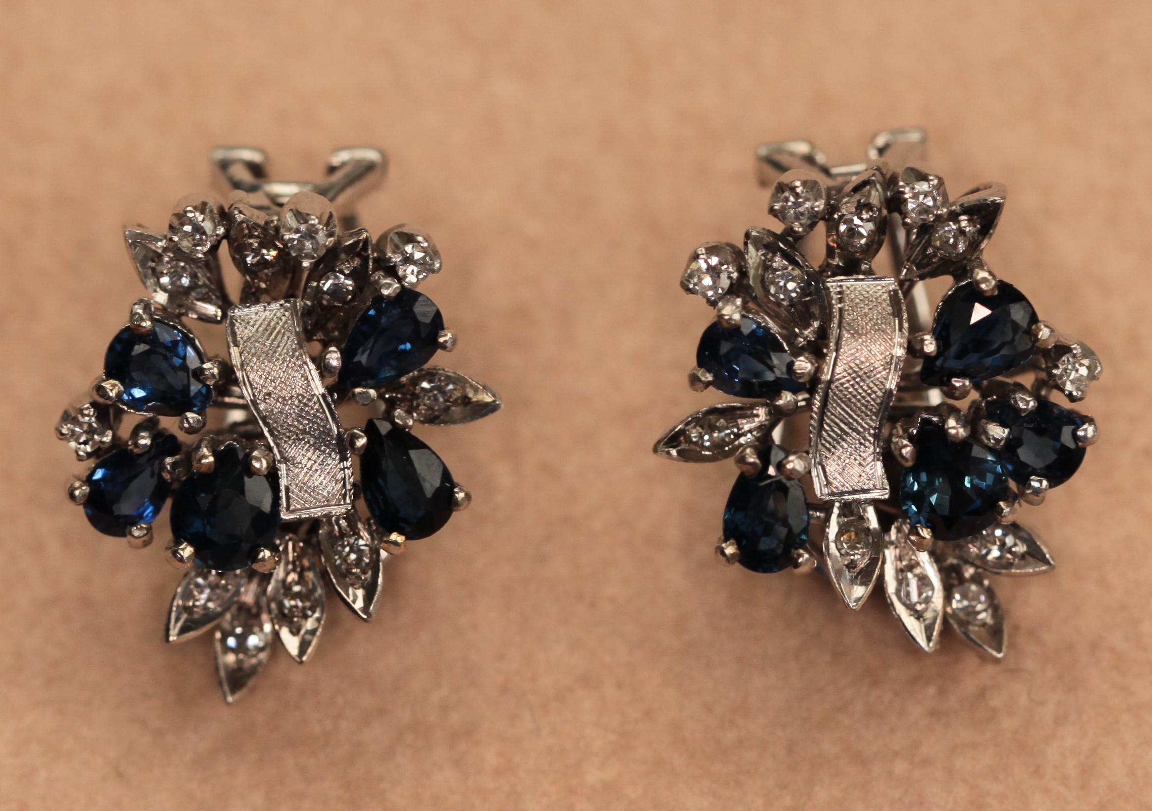 designed as a floral spray claw set with pear shaped sapphires surrounding a curved textured white metal band, accented by lozenge shaped leaves set with small diamonds, with spring clips