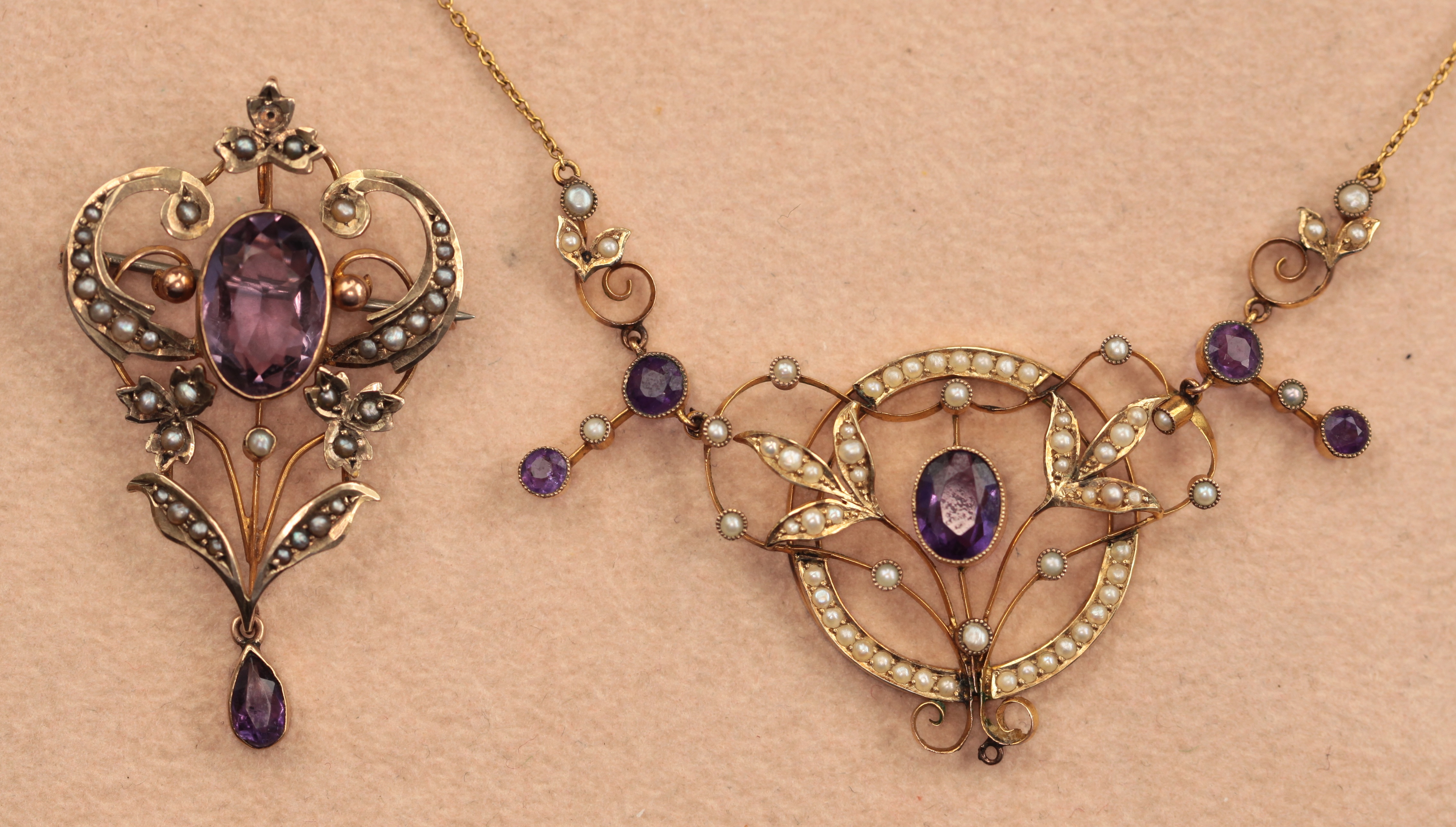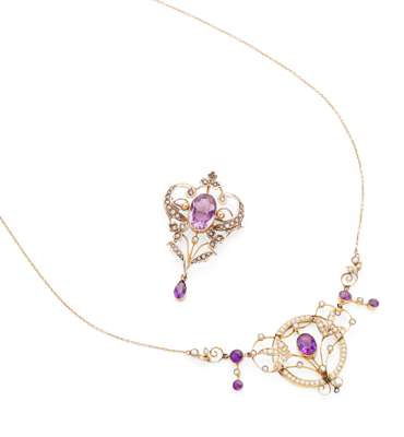 millegrain set to the centre with an oval cut amethyst, in an open border with scrolling detail set with seed pearls, each shoulder suspending a knife bar, millegrain set with two graduated round cut amethysts and a seed pearl, to a belcher link chain; together with brooch of similar design set with seed pearls and amethysts, stamped 9ct (2)