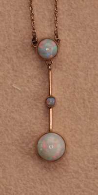 millegrain set in yellow metal with a circular opal cabochon, suspending a knife bar similarly set with two graduated opal cabochons, to a fine belcher link chain, marks indistinct