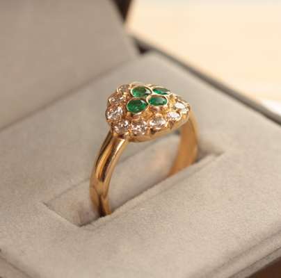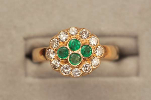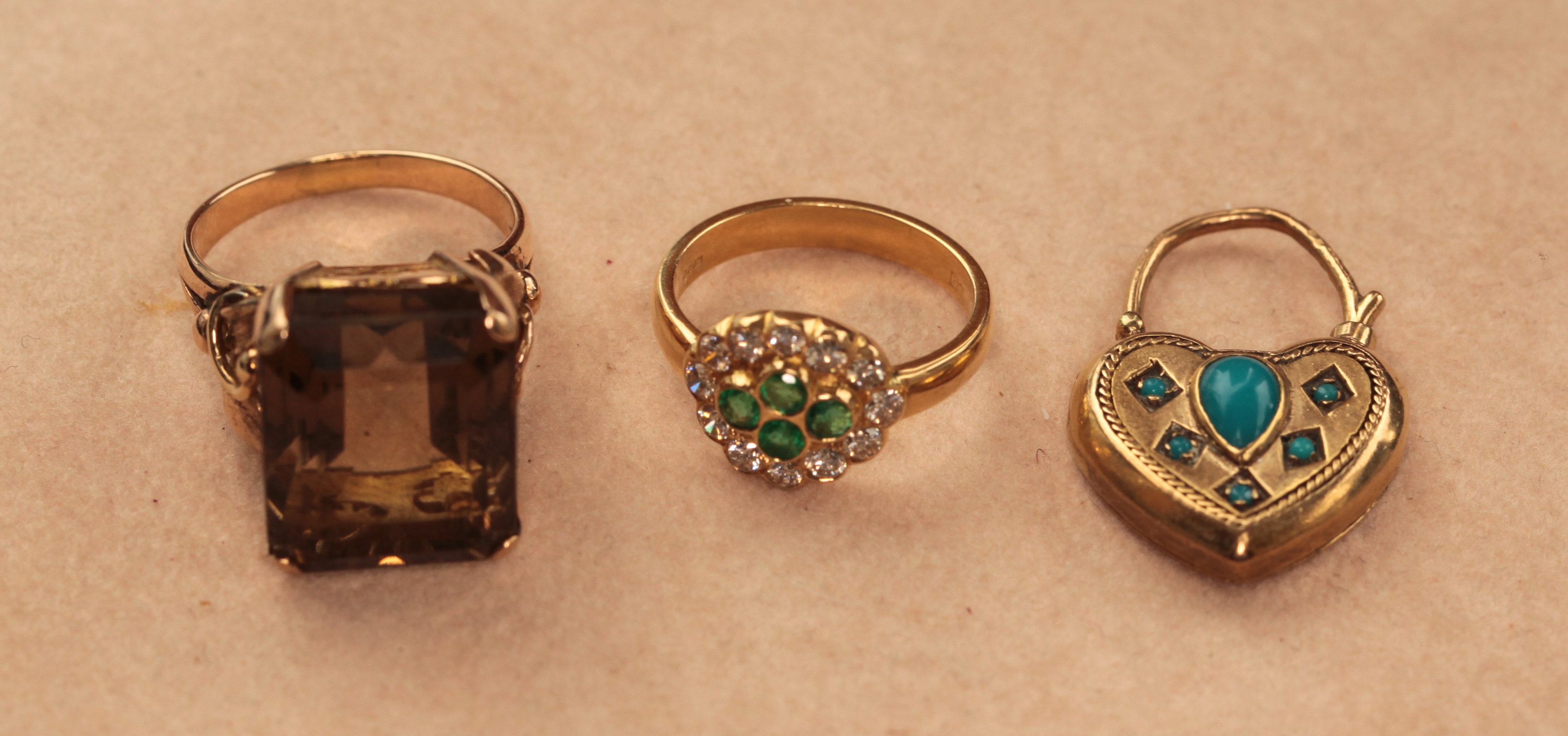 also a gold cross, a turquoise set padlock and an emerald and diamond cluster ring