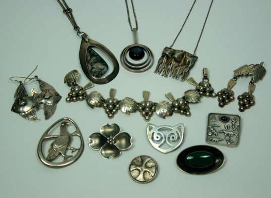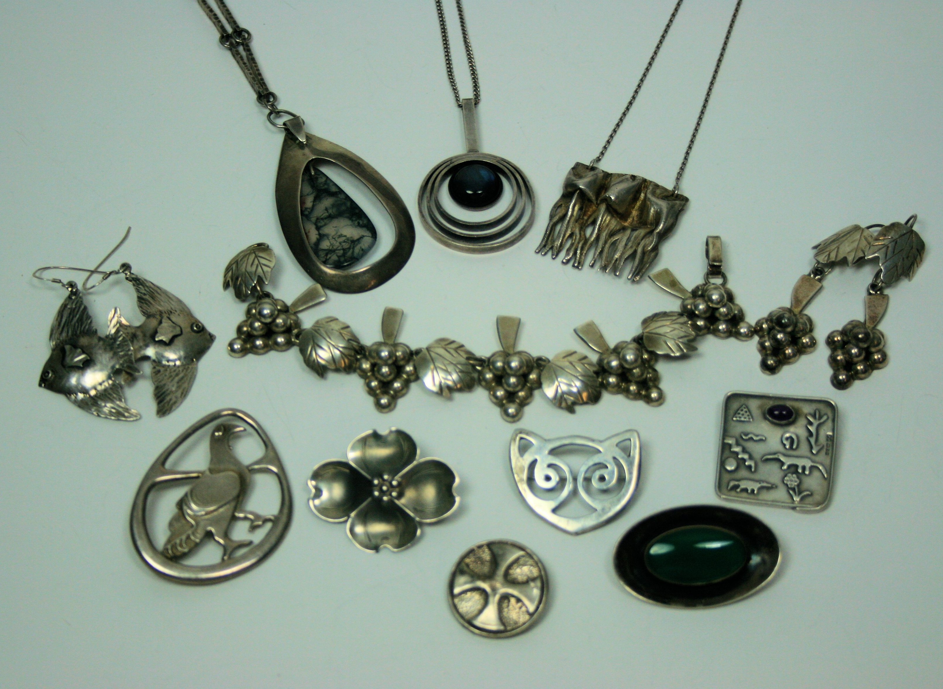 a bracelet and earrings in Jensen style, with grape and leaf decoration; an oval silver brooch by N E From Denmark; Scottish silver brooch decorated with a grouse by Ola Gorie; pair of earrings of Angel fish design; a cast silver brooch; a modernist silver and agate pendant and chain; a silver brooch modelled as a cat's head; a silver modernist pendant of concentric circles and set gem stone; modern silver pendant necklace 'roots'; a panel brooch by PP and titled "Anteaters" also set cabochon amethyst (Qty)