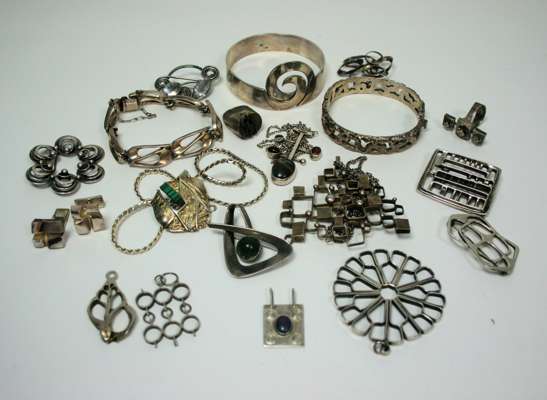 a cast hinged bangle, textured finish; a French bangle with whorl motif; pair cufflinks by Bjorn; four Scandanavian silver brooches; five various rings, brooches; large Scottish modernist pendant by GWS, Edinburgh; silver and malachite set pendant necklace; Scottish silver modernist brooch by Ola Gorie; modernist circular pendant by JS; agate and silver pendant stamped WMOR; a silver bracelet with stylised S links (Qty)