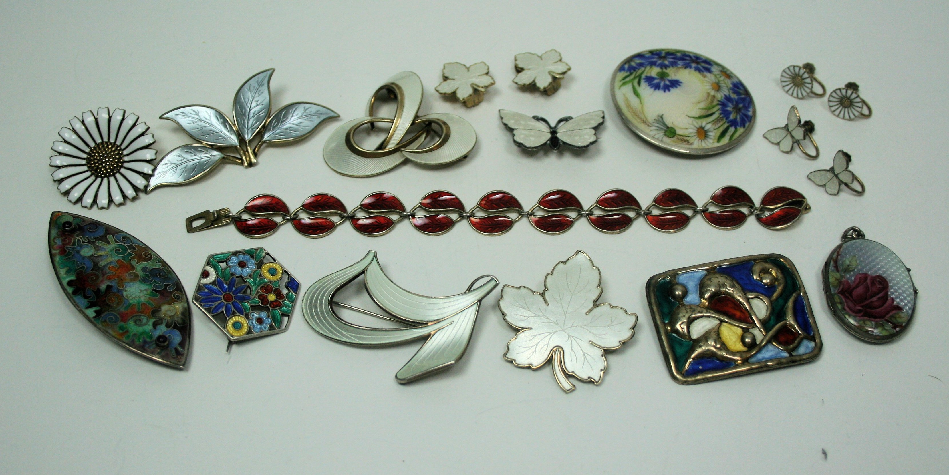 two brooches and ear clip sets by MEKA; panel brooch by Oystein Balle; leaf brooch by David Andersen; leaf bracelet by David Andersen; abstract brooch by Ivar T Holth; abstract brooch by Hroar Prydz; flower head brooch by Anton Michelsen and matching ear clips; four other pieces of enamel jewellery (Qty)