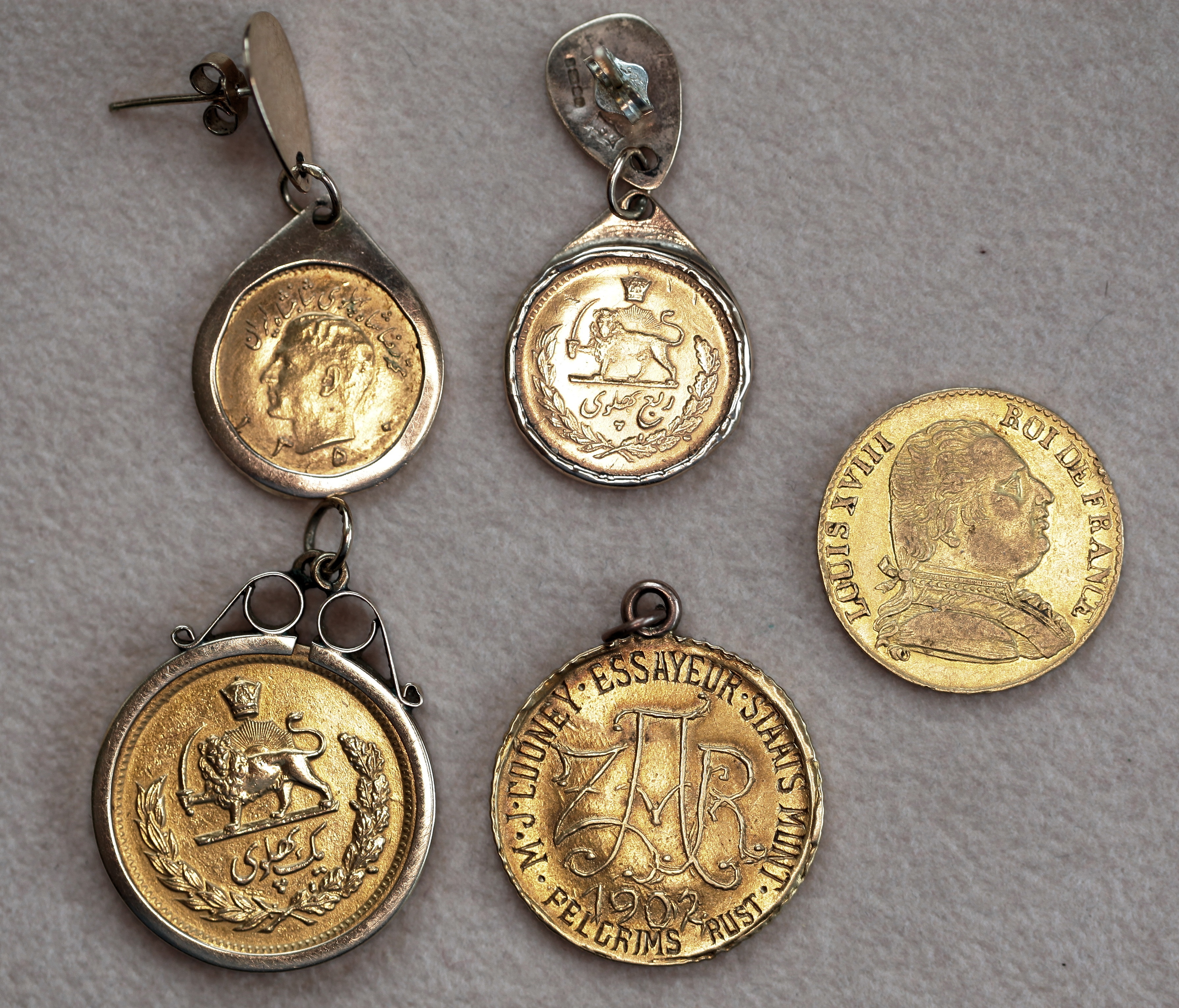 together with a Pond, engraved decoration, three modern Persian gold coins