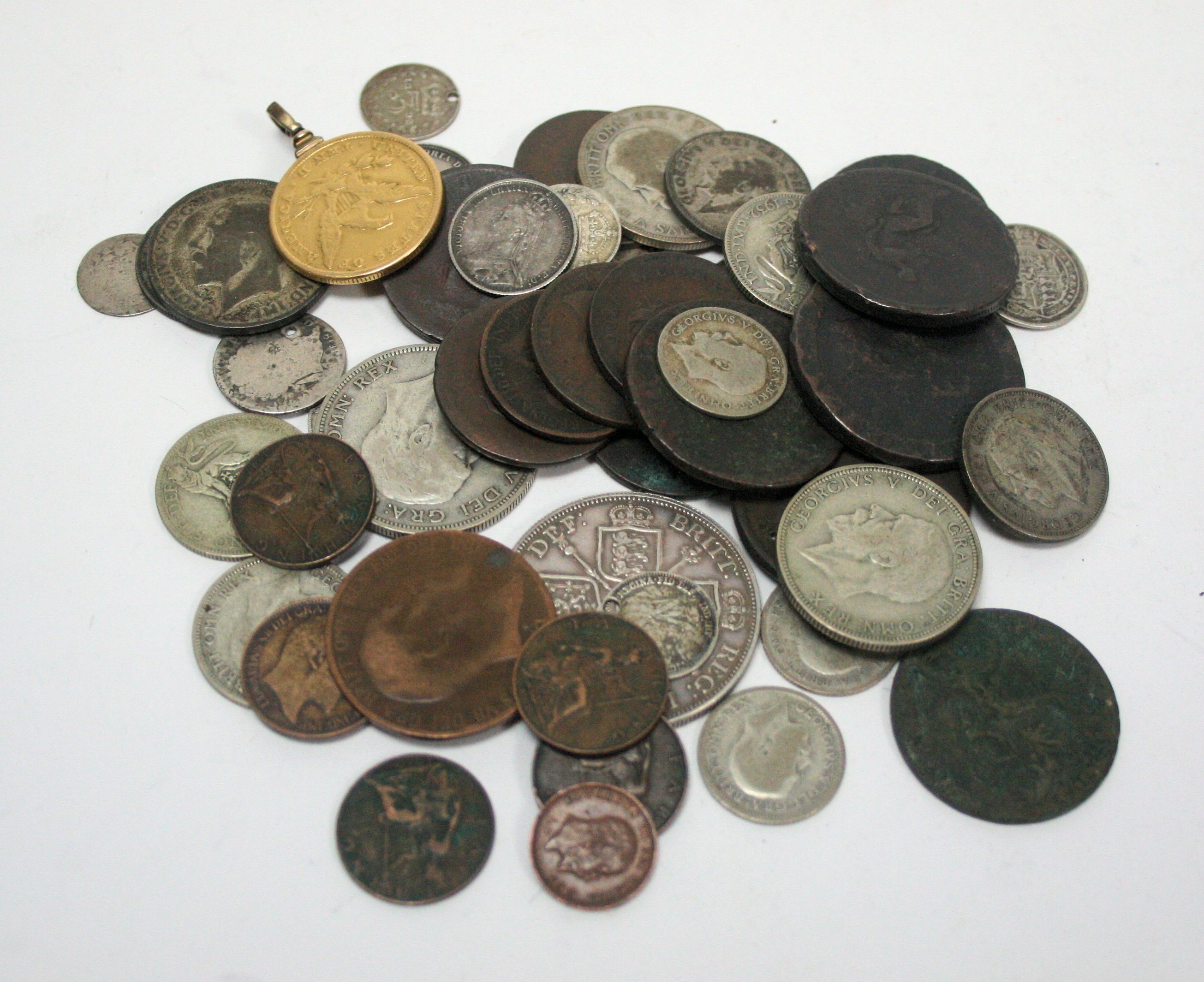 in worn condition with loop solder mounted; together with various silver and base metal British coinage (qty)