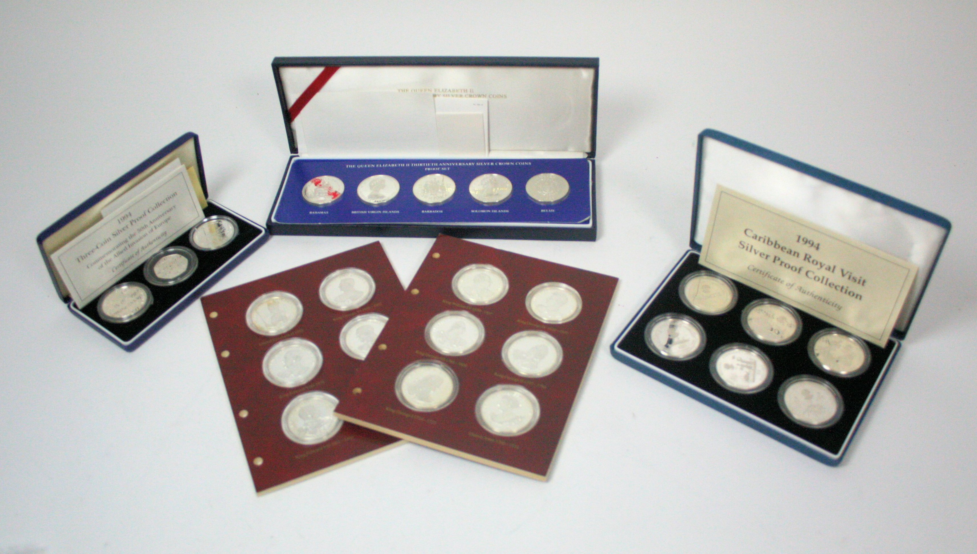 comprising five coins, all of crown size in silver proof; together with twelve Kings & Queens medallions in fitted 'pages' and two modern proof sets (qty)