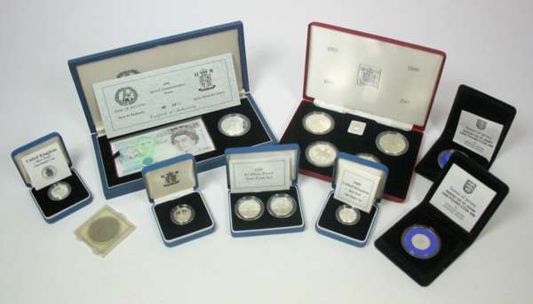 mainly British issues, to include Silver Jubilee four coin set, £5 note and silver proof £5 combination set, various £1 and £2 issues etc (qty)