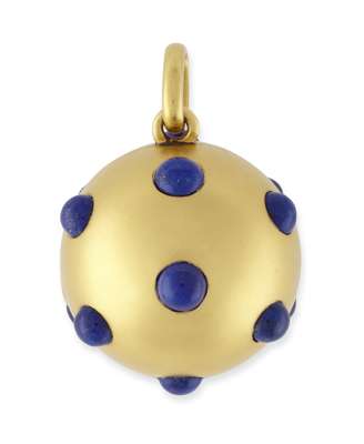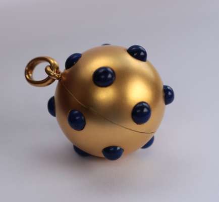 unmarked, of spherical form set throughout with lapis lazuli cabochons, the interior with twin glazed panels, in original fitted case
