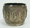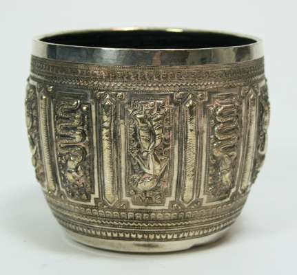 marked Coombes Company Ltd Silversmiths Rangoon, the bowl of tapered form with chased decoration of figures within scroll cartouches, with twin handled and pedestal base; together with another similar sugar bowl with embossed panels and figures etc (2)