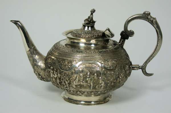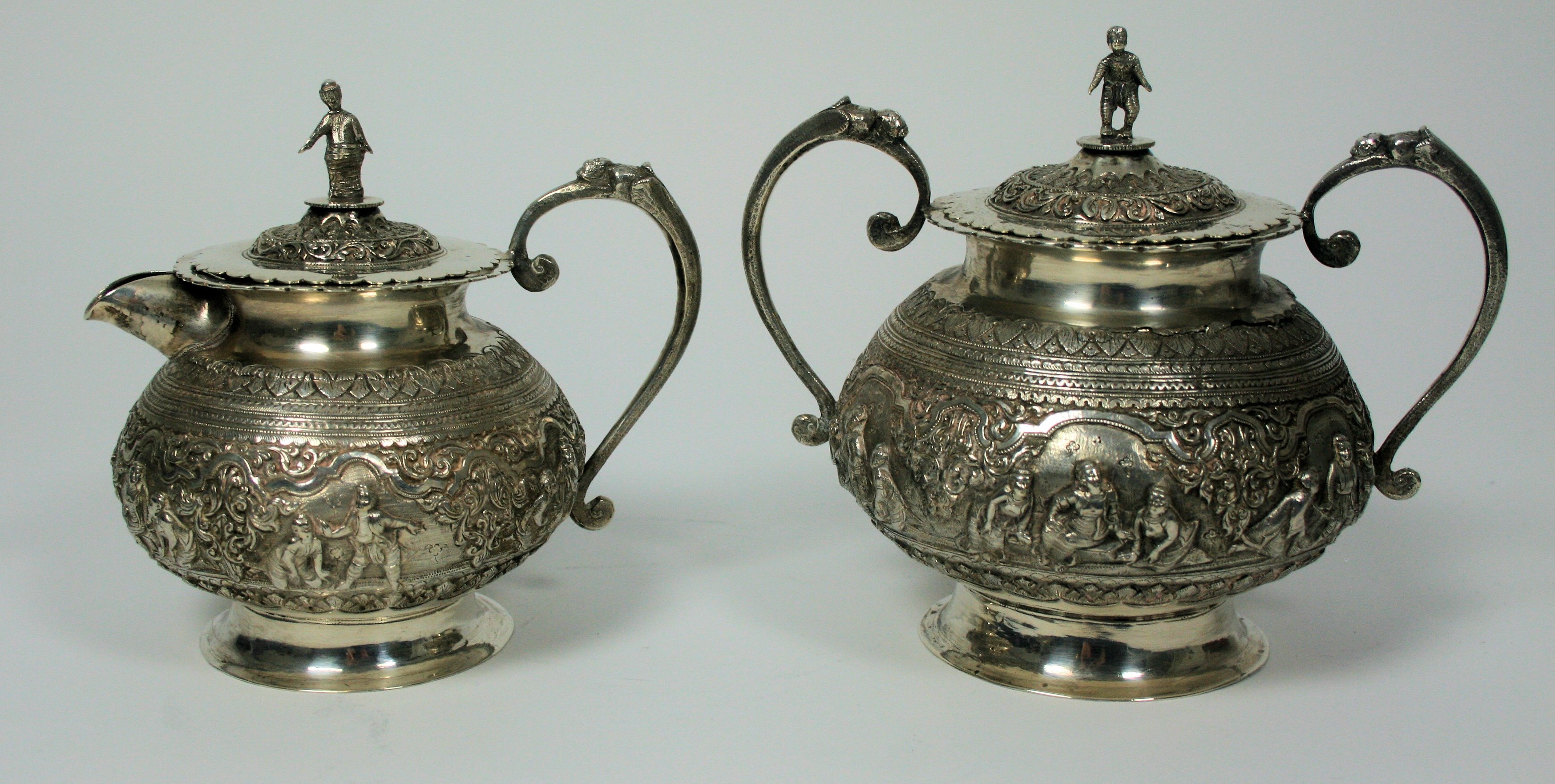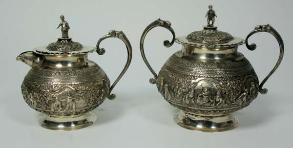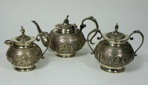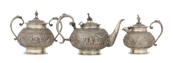 unmarked, comprising teapot, covered twin handled sugar bowl, and cover milk jug, each of baluster form with embossed and chased scenes of figures and deities in scroll formed border, the covers with cast figural finials (3)