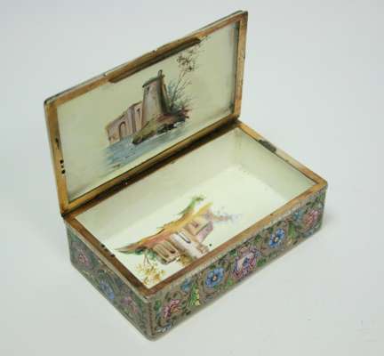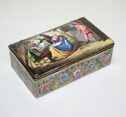 with continental marks, the lid with enamel decoration depicting a rustic scene with figures, the sides and base with foliate decoration with further enamelled scenes to interior