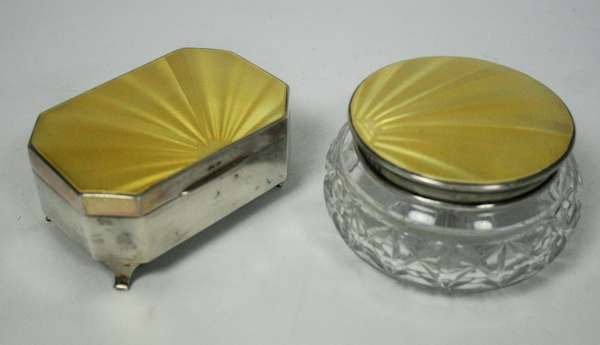 A yellow enamel dressing table box and jewellery box
