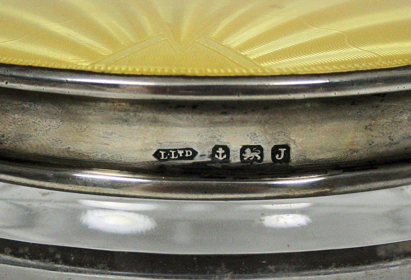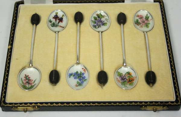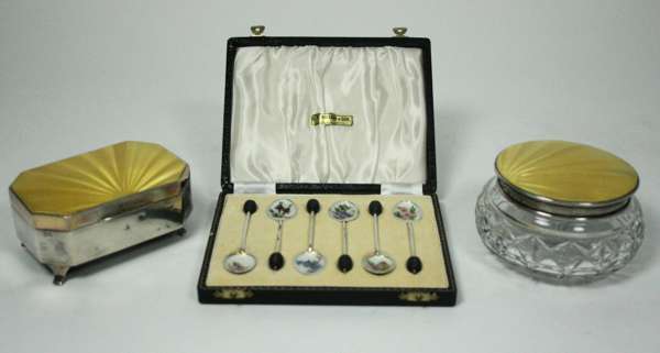 Birmingham 1933, the cut glass bottle and jewellery box with yellow enamel lids; together with a cased set of enamel coffee spoons with floral enamel to bowls (3)