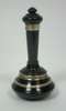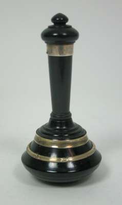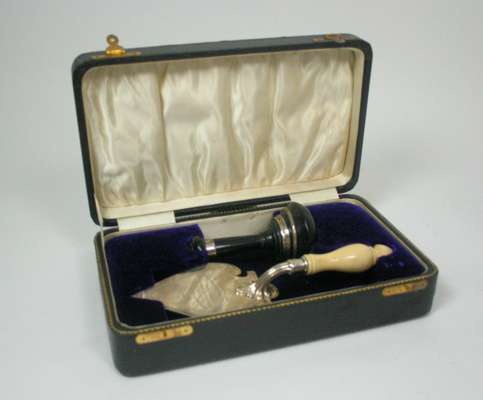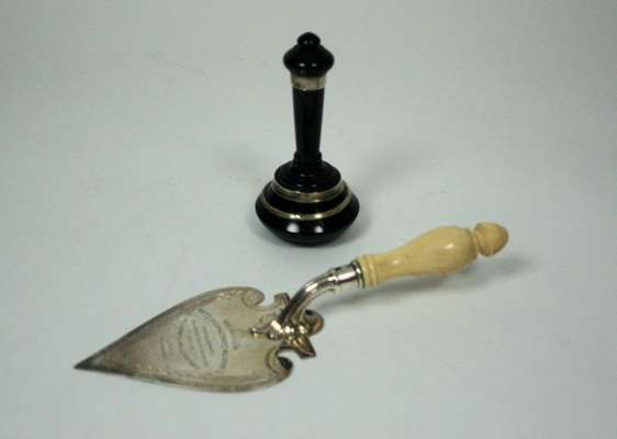 Birmingham 1928, the trowel with shaped triangular blade with Greek key border and simple baluster ivory handle, together with a silver mounted ebony mason's gavel with simple collars and cap, in original fitted box