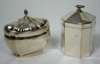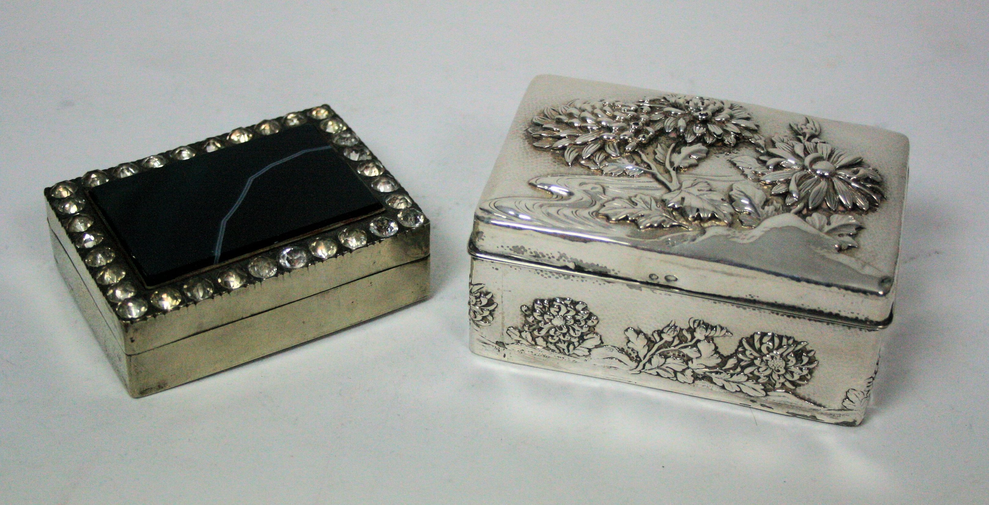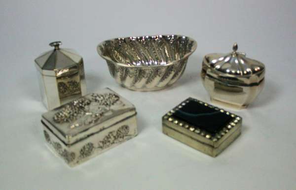 to include two tea caddies (one plated) a paste set silver plated snuff box, an embossed dressing table box and a small sugar basin (qty)