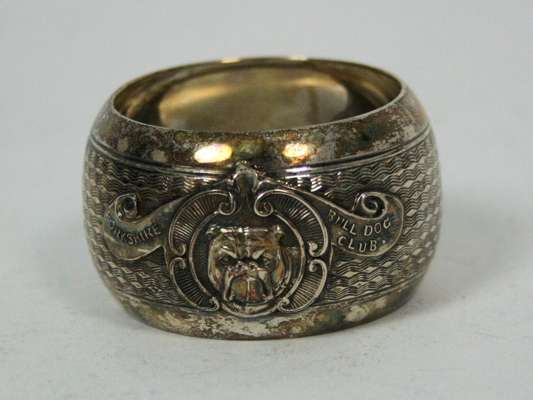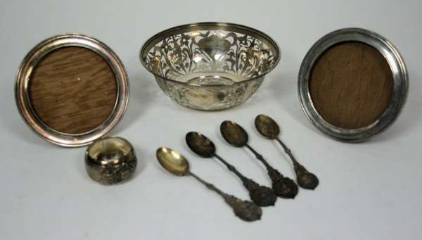to include four Yorkshire Bulldog club spoons; a napkin ring; two plain circular silver photograph frames; a circular silver bowl, pierced and slight engraved decoration (qty)
