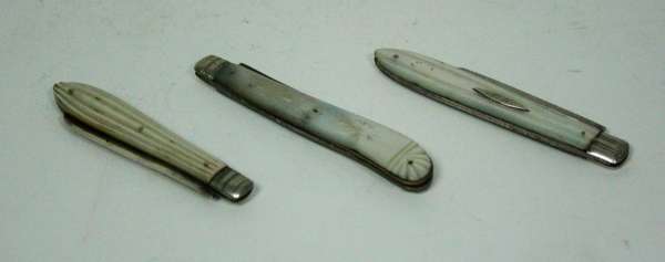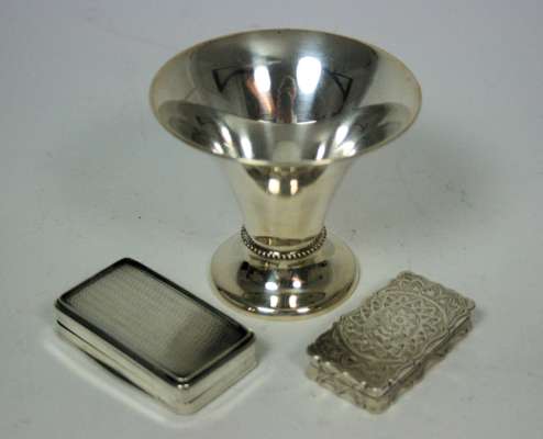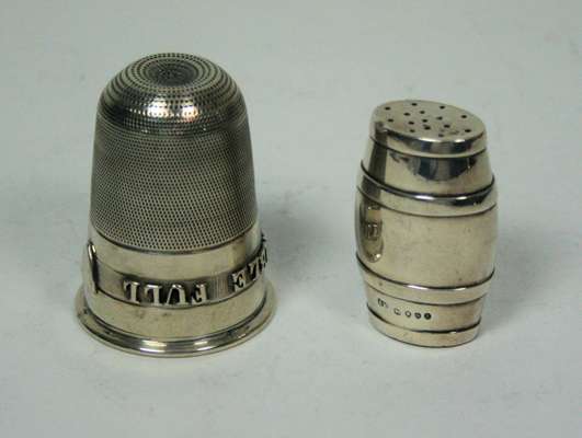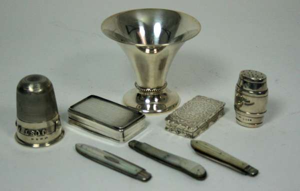 to include two small snuff boxes; three mother of pearl mounted fruit knives, a thimble measure, barrel pepper and a small comport (qty)