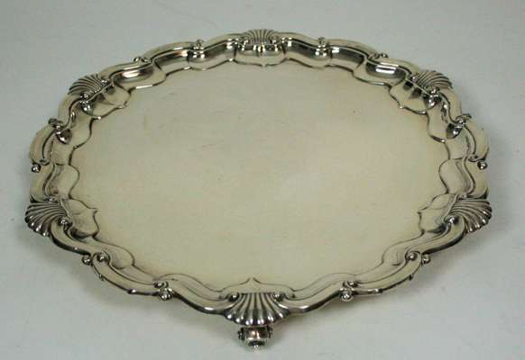 London 1915, of shaped circular outline with shell detail to the scalloped rim, raised on three scrolled formed ball feet