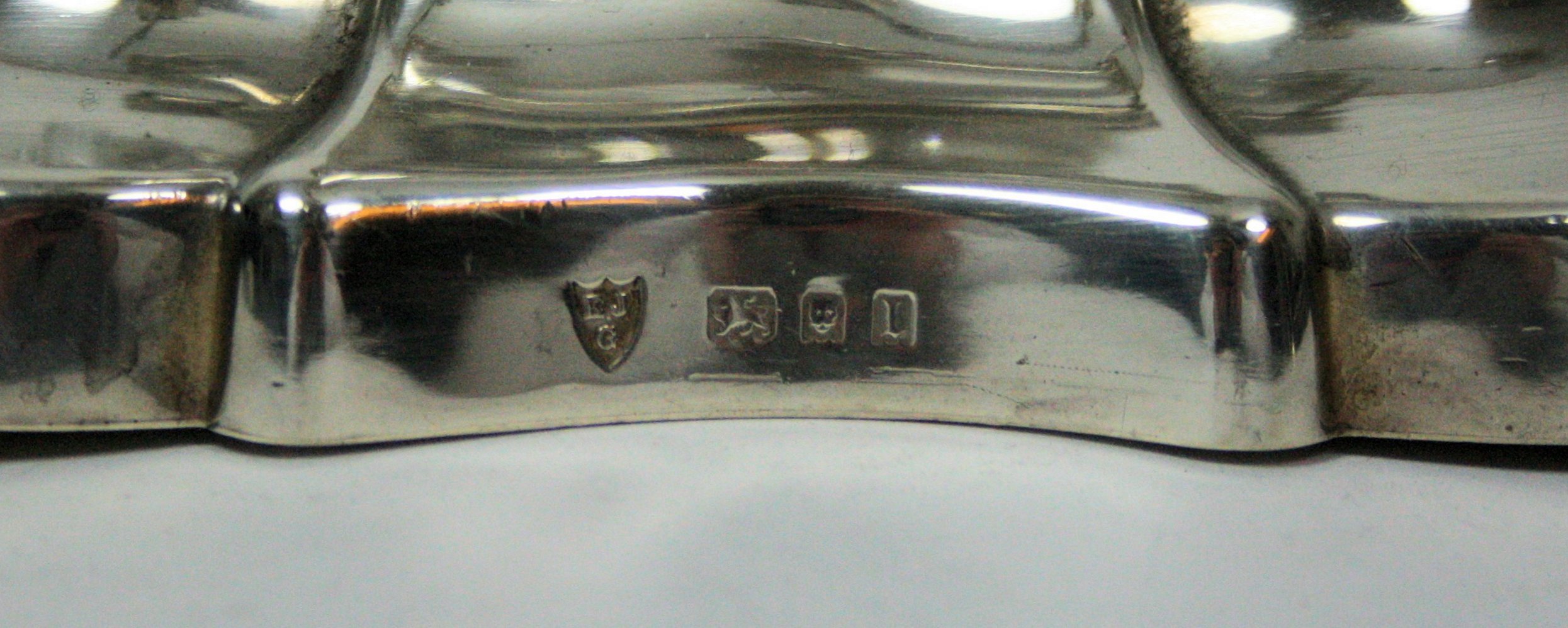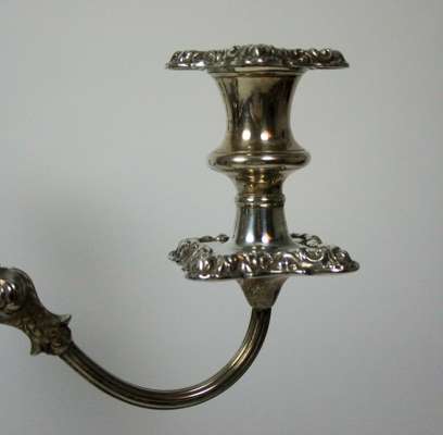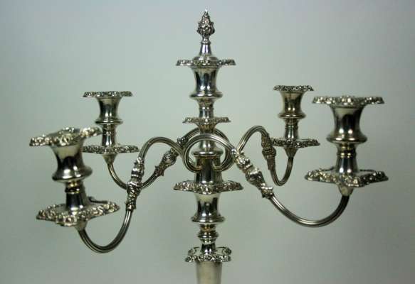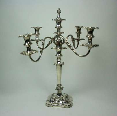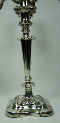 London 1905, the stem of tapering form with leaf clasped detail, raised on a stepped square base with foliate border, with central light and four scrolling branch arms with shaped square drip pans and baluster sconces, scrolling reeded branches