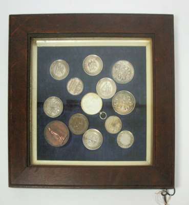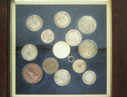 mainly silver but some bronze examples, of conventional forms with engraved inscriptions, with typical decoration of animals, agricultural implements etc (13)