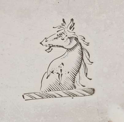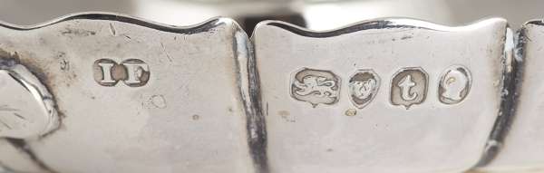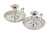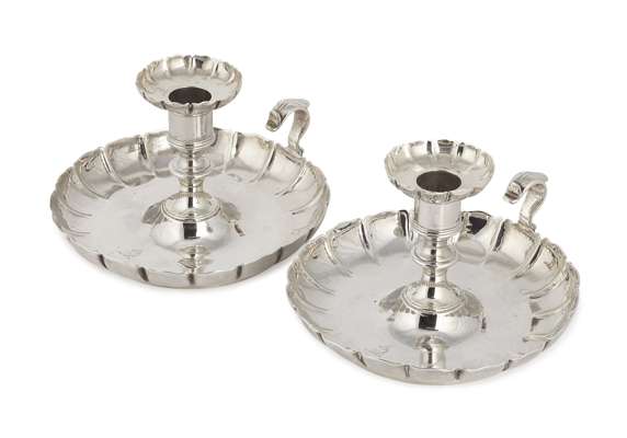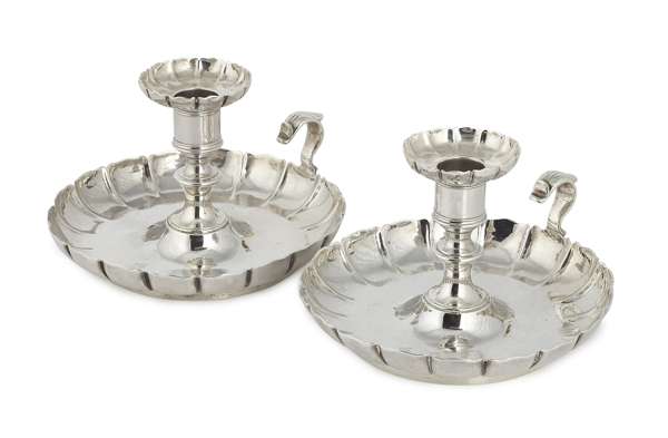 IF in lobed punches, London 1820, the shaped circular bases of lobed form with central baluster sconce with scalloped rim pan, with an acanthus clasped scroll handle