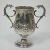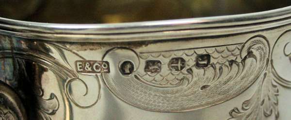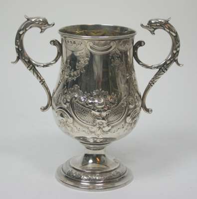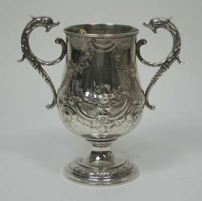 Elkington & Co Birmingham 1858, of bulbous form with chased floral cartouches and borders, with S scroll figural handles