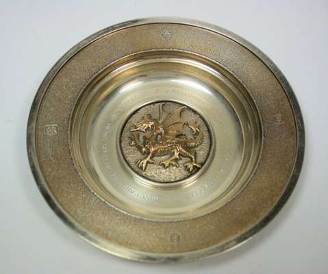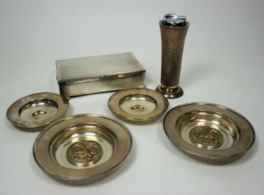 two commemorating Prince of Wales and Lady Diana Spencer's wedding with cast dragon to centre and two smaller plain examples; together with a standing table lighter with textured finish and a table cigarette box (6)