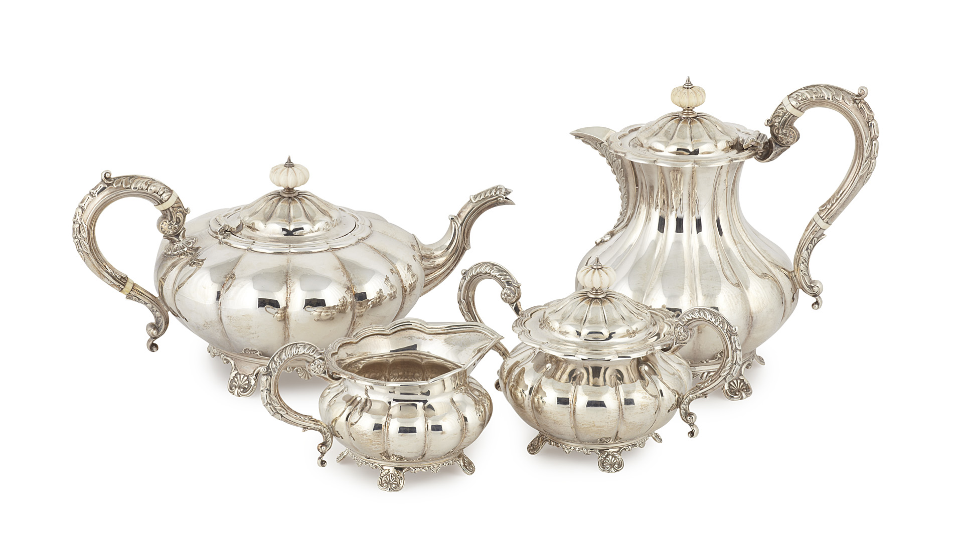 Birmingham 1967, comprising water pot, teapot, covered twin handled sugar bowl, and milk jug, of lobed baluster form with acanthus capped S scroll handles and raised on shell bracket feet (4)