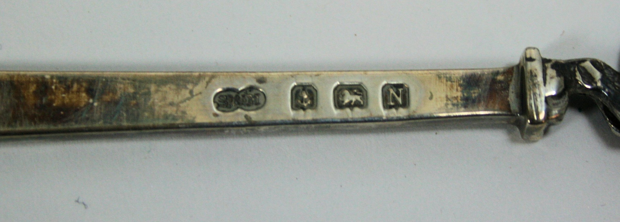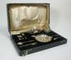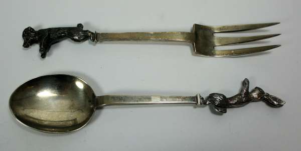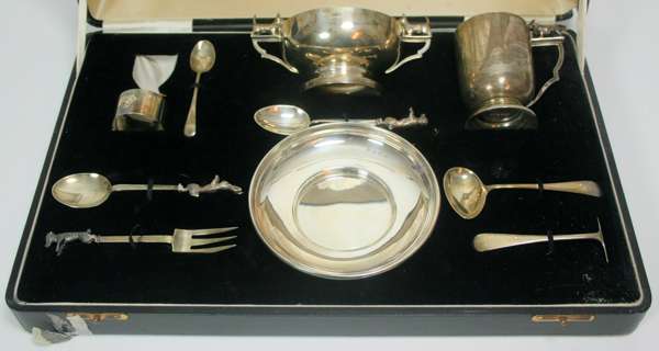 Sanders & Mackenzie, Birmingham 1937, comprising of a porringer, cup, napkin ring and cutlery, all with cast animal detail to handles and finials, together with an associated dish and cutlery of plain design, in a fitted case (10)