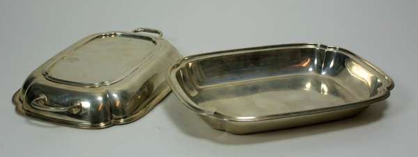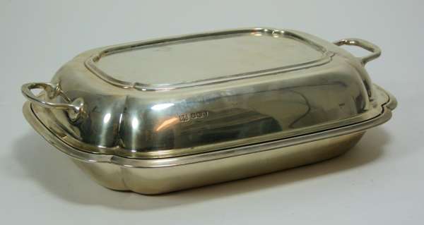 Sheffield 1933, of shaped rectangular outline with moulded rim and pull off cover with twin loop handles