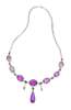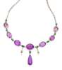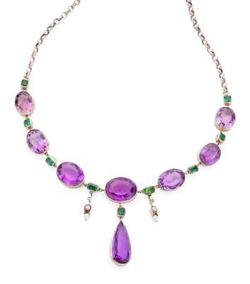 the front collet set with graduated oval cut amethysts interspersed by similarly set trap cut emeralds, additionally fringed to the centre front by small pearls flanking the central large pear cut amethyst drop, the whole suspended from small belcher form links, with hook and ring clasp