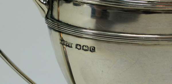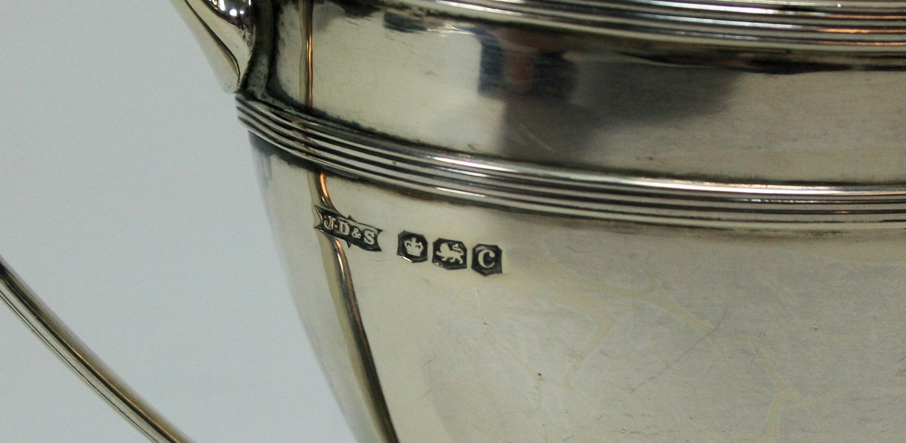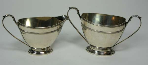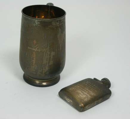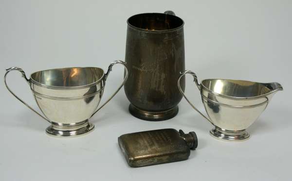 Sheffield 1925, of baluster form with presentation inscription; together with a small hip flask and a modern sugar bowl and cream jug (4)
