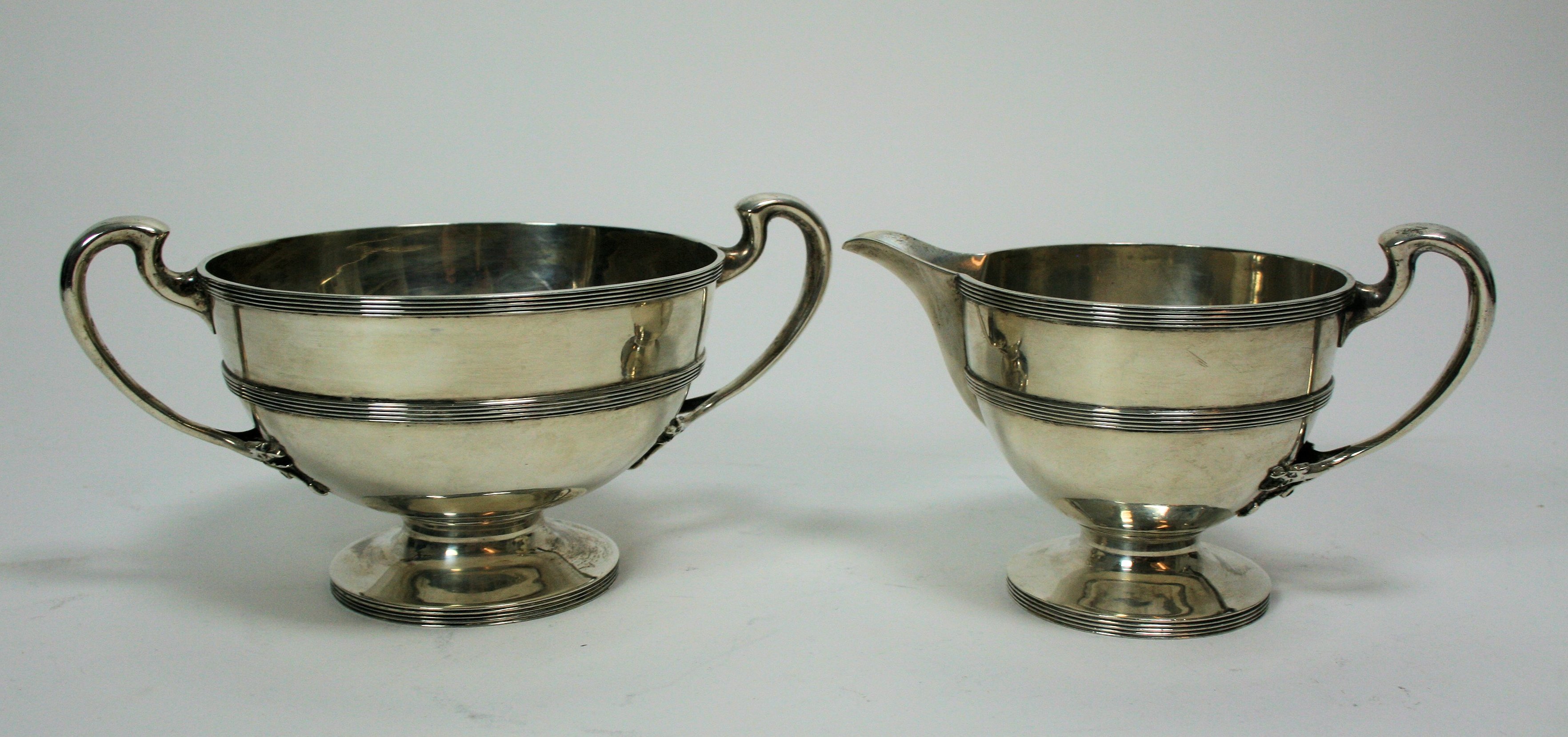Glasgow 1921, comprising teapot, twin handled sugar bowl and milk jug, each with tapered plain body and reeded girdles (3)
