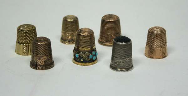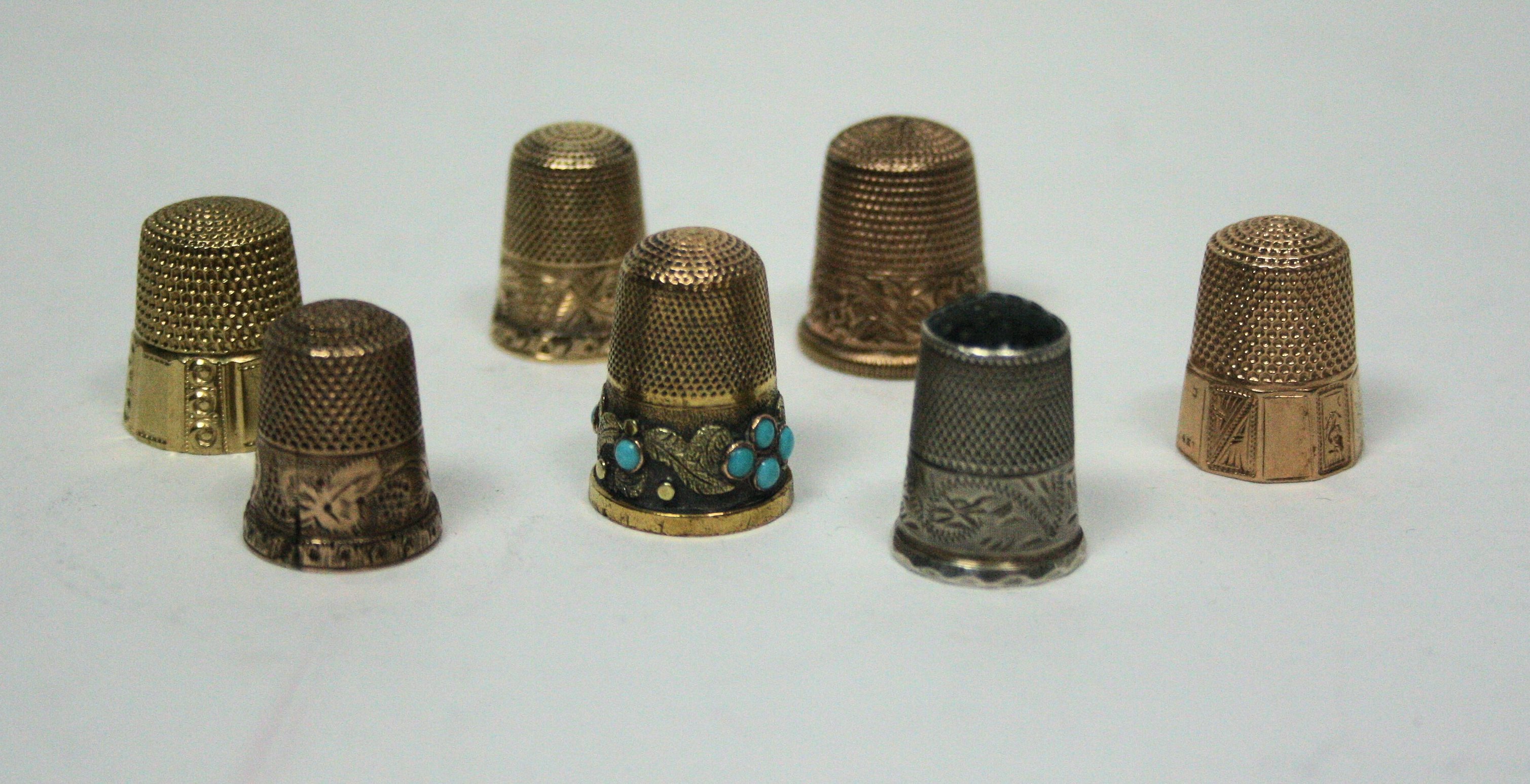 all in yellow metal and unmarked, one set with turquoise cabochons; together with a white metal example (7)