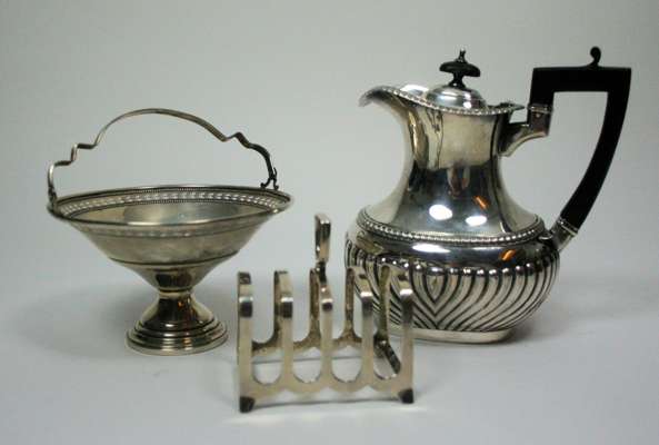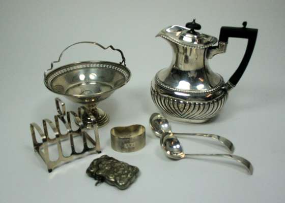 to include a water pot, pedestal bowl, various flatware and a toast rack etc (qty)